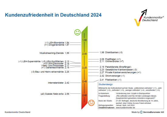 Der Kundenmonitor Deutschland erhebt jährlich zentrale Kennzahlen zur Zufriedenheit, zu erkannten Wettbewerbsvorteilen, zur Weiterempfehlungsbereitschaft von Kunden sowie zu zentralen Verbrauchertrends. Die Studie 2024 basiert auf den Antworten von 27.491 Befragten über ein Online-Panel.