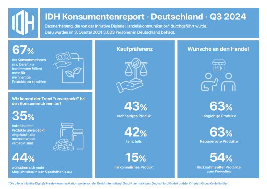 Immer mehr Konsumentinnen und Konsumenten legen Wert auf verpackungsfreie und nachhaltige Produkte. Bereits 35 Prozent haben Produkte unverpackt gekauft, die normalerweise verpackt sind, und 44 Prozent wünschen sich mehr Möglichkeiten, verpackungsfrei einzukaufen. Gleichzeitig bevorzugen 43 Prozent nachhaltige Produkte klar vor herkömmlichen Alternativen, während 42 Prozent dies teilweise tun. Das sind Ergebnisse des aktuellen vierteljährlichen Konsumentenreports der Initiative Digitale Handelskommunikation (IDH), die von Bonial, Marktguru und Offerista angeführt wird. Darin heißt es auch, dass 23 Prozent der Befragten bereit sind, für nachhaltige Produkte einen höheren Preis zu zahlen, weitere 44 Prozent teilweise.