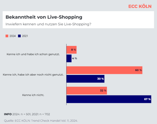 Während die Bekanntheit von Live-Shopping 2024 gestiegen ist – sechs von zehn Befragten kennen den Begriff (2021: 30 Prozent) – wird das Angebot nur selten genutzt (8 Prozent). Künftig können sich 21 Prozent (18- bis 29-Jährige: 34 Prozent) vorstellen, an einem Live-Shopping-Event teilzunehmen. Am ehesten ist dies aus Konsumentensicht im Onlineshop eines Händlers oder Herstellers (22 Prozent; 18-bis 29-Jährige: 33 Prozent) vorstellbar. Auch Formate wie In-Stream-Shopping kommen nur mäßig an: 27 Prozent finden das Format interessant, unter den Jüngeren sind es 52 Prozent.