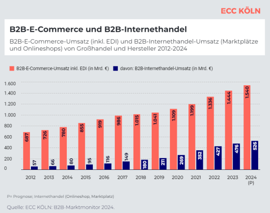 Der B2B-E-Commerce verzeichnete im Jahr 2023 ein anhaltendes Wachstum und steigerte seine Umsätze über alle betrachteten Wirtschaftszweige hinweg um 8,1 Prozent im Vergleich zum Vorjahr. Das zeigen die Ergebnisse des B2B-Marktmonitors 2024 des ECC Köln in Zusammenarbeit mit Creditreform, Intershop und CGI. Demnach wurden im vergangenen Jahr etwa ein Viertel der B2B-Umsätze online realisiert.