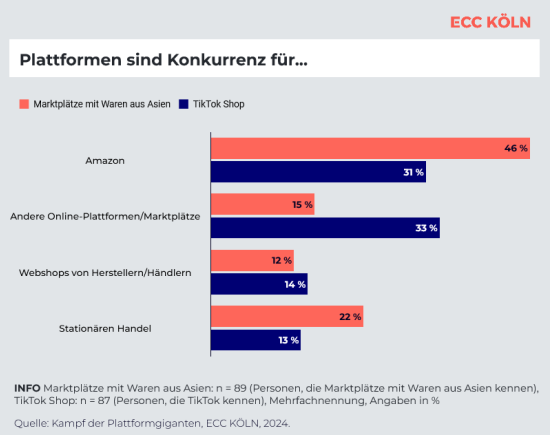 Deutsche Händler sehen aktuell weder Marktplätze mit Waren aus Asien wie Temu oder Shein (65 Prozent) noch den für 2025 in Deutschland angekündigten Tiktok-Shop (67 Prozent) mittelfristig als Bedrohung für das eigene Unternehmen. Sie stellen allerdings fest, dass die Konsumentinnen und Konsumenten trotz des schlechten Images der Asia-Plattformen dort kaufen; vor allem Temu erreicht eine große Käuferschaft. Das sind Ergebnisse der ECC-Club-Studie „Kampf der Plattformgiganten“, die gefragt hat: Wie bewerten deutsche Händler diese Plattformen?