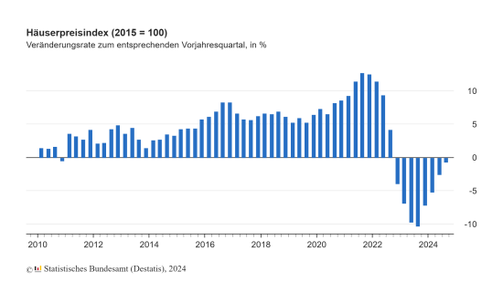 Die Preise für Wohnimmobilien (Häuserpreisindex) in Deutschland sind im dritten Quartal 2024 gegenüber dem dritten Quartal 2023 um durchschnittlich 0,7 Prozent gesunken. Im zweiten Quartal 2024 lag der Rückgang gegenüber dem Vorjahresquartal noch bei 2,5 Prozent. Gegenüber dem Vorquartal sind die Preise für Wohnimmobilien um 0,3 Prozent gestiegen und damit weniger stark als im zweiten Quartal 2024 (+1,5 Prozent). Das zeigen aktuelle Daten des Statistischen Bundesamtes (Destatis).