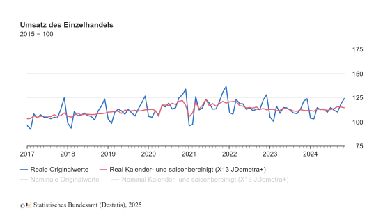 Im Einzelhandel mit Nicht-Lebensmitteln stieg der kalender- und saisonbereinigte Umsatz im November 2024 real um 2,3 Prozent und nominal um 2,5 Prozent gegenüber dem Vorjahresmonat. Bereits im September 2024 und Oktober 2024 hatte der reale Umsatz gegenüber dem jeweiligen Vorjahresmonat einen deutlichen Anstieg erfahren (+7,8 Prozent und +2,3 Prozent), nachdem die Umsätze von Januar bis August 2024 real 0,7 Prozent unter denen des Vorjahreszeitraums gelegen hatten.
