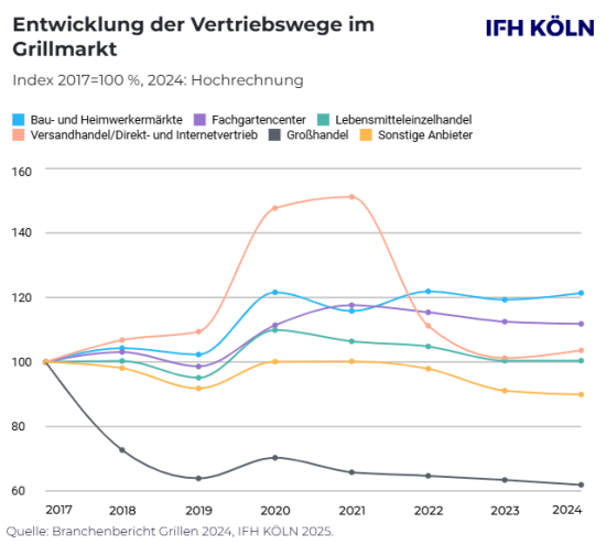 Während viele Branchen noch mit den Folgen des E-Commerce-Booms kämpften, bleibe der stationäre Handel im Grillmarkt führend – was sich voraussichtlich auch 2025 nicht ändern werde, so Dominik Kudet, Projektmanager am IFH Köln. Derzeit entfalle mehr als die Hälfte des Marktanteils auf Bau- und Heimwerkermärkte sowie Fachgartencenter.
