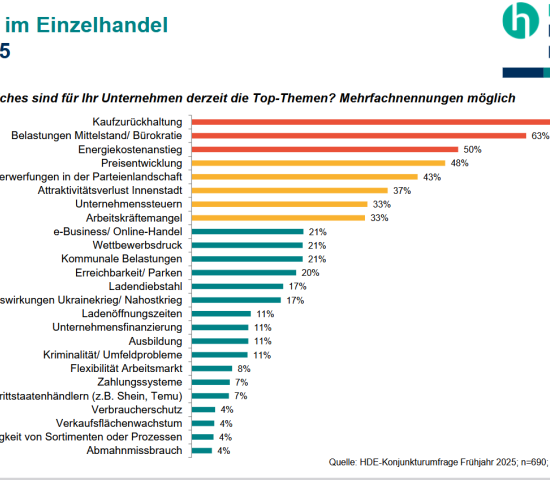 In der jüngsten HDE-Konjunkturumfrage nennen 72 Prozent der befragten Handelsunternehmen die Kaufzurückhaltung als das wichtigste Top-Thema. Es folgen Belastungen des Mittelstands und Bürokratie mit 63 Prozent und der Energiekostenanstieg mit 50 Prozent.