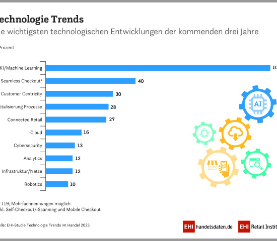 Künstliche Intelligenz ist der Top-Trend im Handel, da sind sich die IT-Verantwortlichen der vom EHI Retail Institute befragten Handelsunternehmen einig. „Es ist eine Premiere: Zum ersten Mal haben wir auf eine Frage 100 Prozent Zustimmung bekommen“, berichtet Imke Hahn, Projektmanagerin Retail Technology beim EHI, auf der Messe Eurocis von der EHI-Studie „Technologie-Trends im Handel 2025". Die meisten befragten IT-Verantwortlichen kommen aus dem Lebensmittel- und Modehandel, allerdings auch 16 Prozent aus der Branche DIY und Einrichten.