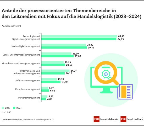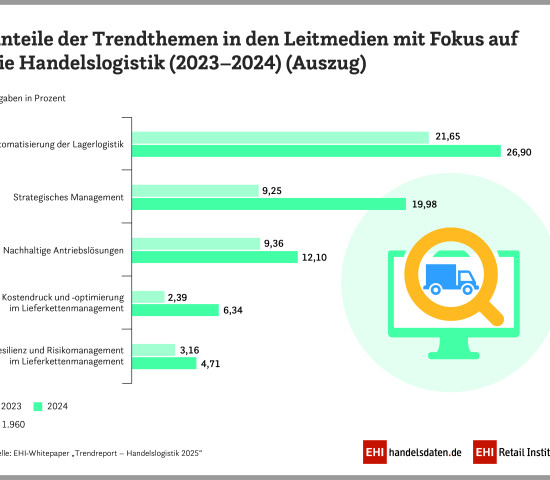 Das EHI hat für das Whitepaper Beiträge in führenden Fachmagazinen zur Handelslogistik systematisch analysiert. Technologie- und Digitalisierungsmanagement bleibt mit einem leichten Rückgang von 65,4 Prozent in 2023 auf 64,7 Prozent im Jahr 2024 weiterhin eines der dominierenden Themen in der Fachpresse. Das deute darauf hin, dass Digitalisierung in der Handelslogistik bereits tief verankert ist und die Optimierung bestehender Systeme im Vordergrund steht.