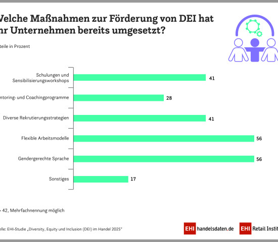 Hinsichtlich der Umsetzbarkeit dieser Maßnahmen ist der Handel vor allem bei flexiblen Arbeitszeiten und der gendergerechten Sprache (je 56 Prozent) weit fortgeschritten. Diverse Recruiting-Strategien und Workshops zum Thema setzen jeweils 41 Prozent um. Ein Problem dabei: 48 Prozent messen den Erfolg ihrer DEI-Maßnahmen bislang überhaupt nicht.