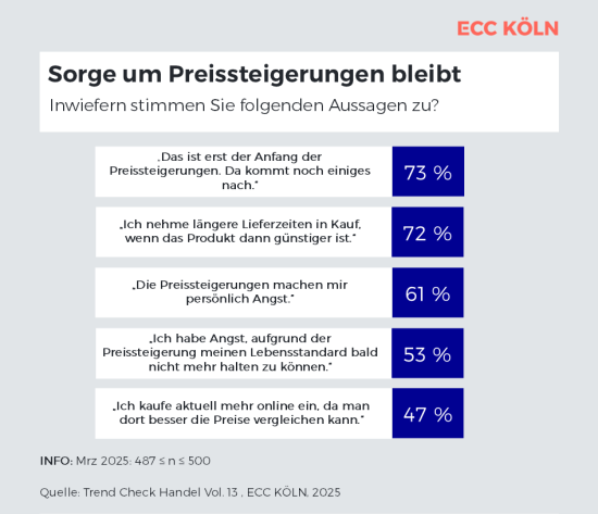 Mit einem Rückgang von 10 Prozentpunkten zum Oktober 2024 (57 Prozent) gibt immer noch knapp die Hälfte (47 Prozent) an, dass sie aufgrund des einfacheren Preisvergleichs vermehrt den Onlinekanal nutzt. Zudem nehmen knapp drei Viertel der Befragten (72 Prozent) weiterhin längere Lieferzeiten in Kauf, wenn das Produkt dann günstiger ist.