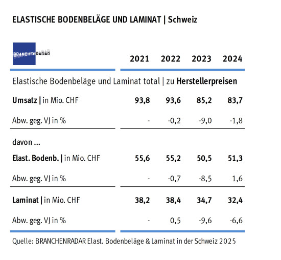 In der Schweiz drehte der Markt für elastische Bodenbeläge im Jahr 2024 wieder auf Wachstumskurs. Laminat machte den Trend nicht mit, zeigen Daten einer Studie des Marktforschungsinstituts Branchenradar. Leichte Wachstumsimpulse im Nicht-Wohnbau befeuerten demnach im vergangenen Jahr den Markt. Laut aktuellem Branchenradar „Elastische Bodenbeläge und Laminat in der Schweiz“ sind die Herstellererlöse 2024 um 1,6 Prozent gegenüber Vorjahr gestiegen. Da der Umsatz mit Laminat aber ein weiteres Jahr deutlich sank, verringerte sich der Gesamtumsatz mit elastischen Bodenbelägen und Laminat um 1,8 Prozent gegenüber dem Vorjahr auf 83,7 Mio. Schweizer Franken. Mit Laminat wurden zuletzt um fast 6 Prozent weniger umgesetzt als im Jahr davor.