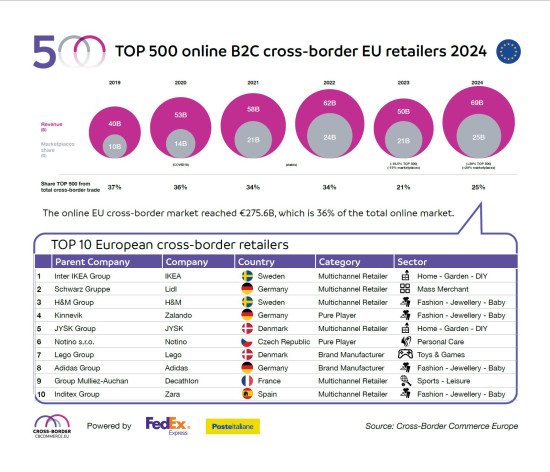 Der Umsatz der 500 größten europäischen grenzüberschreitend tätigen B2C-Marken ist auf 69,5 Mrd. Euro gewachsen, was einem Plus von 39 Prozent gegenüber dem Vorjahr entspricht. Auf Platz eins des Rankings steht nach wie vor Ikea. Die schwedische Möbelkette weist einen grenzüberschreitenden Umsatz in Höhe von 5,2 Mrd. Euro aus. Der Discounter Lidl steht auf Platz zwei.