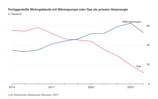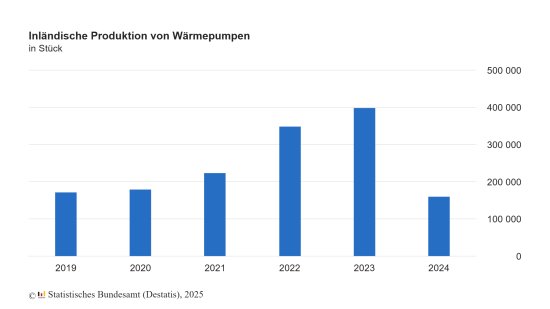 Derweil gingen die Produktionszahlen von Wärmepumpen deutlich zurück und erreichten den niedrigsten Stand innerhalb der vergangenen sechs Jahre: Im Jahr 2024 wurden in Deutschland rund 162.400 Anlagen im Wert von 587 Mio. Euro hergestellt. Mengenmäßig waren das 59,4 Prozent weniger als im Jahr zuvor mit rund 400.100 Wärmepumpen im Wert von 1,2 Mrd. Euro.