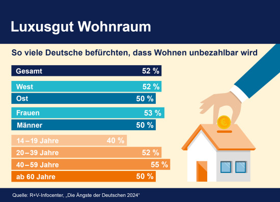 Mehr als die Hälfte der Deutschen befürchtet, dass Wohnen unbezahlbar wird. Das ist ein Ergebnis der R+V-Studie „Die Ängste der Deutschen 2024“. Es ist eine der drei größten Sorgen der Befragten, 52 Prozent gaben dies an. Am meisten fürchten sich die Menschen demnach vor steigenden Lebenshaltungskosten. 56 Prozent der Befragten fürchten, dass der Staat durch die Zahl der Geflüchteten überfordert ist. In der Langzeitstudie befragt das Infocenter der R+V Versicherung seit 1992 jedes Jahr rund 2.400 Menschen nach ihren größten Ängsten rund um Politik, Wirtschaft, Gesellschaft, Umwelt und Gesundheit.