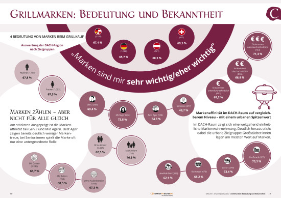 Weitere Erkenntnisse lesen sich wie folgt: Während Gen Z (76,8 Prozent) und Haushalte mit Kindern (78,9 Prozent) besonders häufig den Kauf von Grillzubehör planen, sind die Senioren mit 35,4 Prozent deutlich zurückhaltender. Zudem wächst das Interesse an neuen Technologien mit dem Einkommen und dem Urbanitätsgrad der Wohnsituation. Marke ist insbesondere für Großstadtbewohner und jüngere Zielgruppen ein Kriterium, für die älteren Konsumenten steht die Funktionalität im Vordergrund.