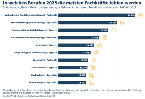Insgesamt prognostiziert die IW-Studie für 2028 eine Lücke von bundesweit 768.000 Fachkräften. „Dass aktuell die Zahl der offenen Stellen zurückgeht, darf nicht über den strukturellen Fachkräftemangel in vielen Bereichen hinwegtäuschen. Insbesondere in Berufen, die eine abgeschlossene Berufsausbildung erfordern, fehlen Mitarbeiter. Diese machen mehr als die Hälfte der gesamten Fachkräftelücke aus. Unternehmen haben hier zudem immer größere Schwierigkeiten, ihre angebotenen Ausbildungsplätze zu besetzen“, sagt IW-Experte Alexander Burstedde.