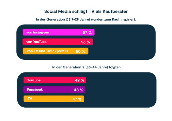Bei den jungen Leuten haben die sozialen Medien das Fernsehen indessen überholt. In der Gen Z (16 bis 29 Jahre) wurden 57 Prozent der Nutzer vor allem durch Instagram zu einem Kauf bewegt. Von Youtube ließen sich 56 Prozent inspirieren. TV motivierte gleichauf mit Tiktok die Hälfte. In der Gen Y (30 bis 44 Jahre) besitzt neben Youtube auch Facebook einen stärkeren Einfluss auf Konsumentscheidungen als das Fernsehen: Dem Videokanal folgten 49 Prozent, dem Netzwerk 48 Prozent und TV 47 Prozent.