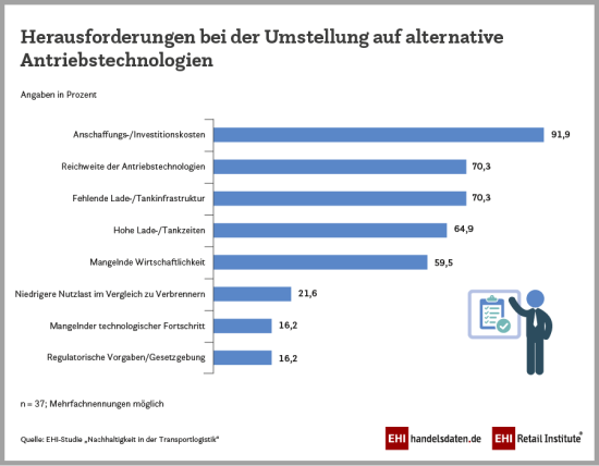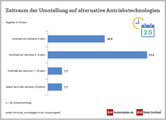 Mehr als 70 Prozent der befragten Unternehmen aus dem Bereich der Handelslogistik befinden sich im Umstellungsprozess oder bereiten diesen vor. Rund 85 Prozent wollen innerhalb der kommenden sechs Jahre auf alternative Antriebstechnologien umsteigen, davon 30 Prozent in den kommenden drei Jahren.