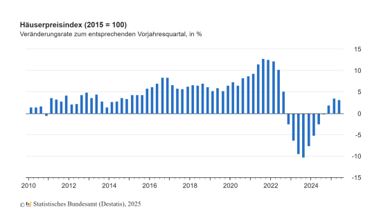 Die Preise für Wohnimmobilien in Deutschland sind im zweiten Quartal 2025 um durchschnittlich 3,2 Prozent gegenüber dem Vorjahresquartal gestiegen. Damit stiegen sie zum dritten Mal in Folge gegenüber dem jeweiligen Vorjahresquartal, nachdem sie zuvor seit dem vierten Quartal 2022 durchgängig gesunken waren. Im ersten Quartal 2025 hatte der Anstieg im Vorjahresvergleich bei 3,5 Prozent gelegen, im vierten Quartal 2024 bei 1,9 Prozent. Gegenüber dem ersten Quartal 2025 erhöhten sich die Preise für Wohnimmobilien im zweiten Quartal 2025 um 1,1 Prozent.