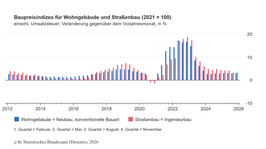 Die Preise für den Neubau konventionell gefertigter Wohngebäude in Deutschland sind im November 2025 um 3,2 Prozent gegenüber dem Vorjahresmonat gestiegen. Im August 2025, dem vorherigen Berichtsmonat der Statistik, hatte der Preisanstieg im Vorjahresvergleich 3,1 Prozent betragen. Wie das Statistische Bundesamt (Destatis) weiter mitteilt, erhöhten sich die Baupreise im November 2025 gegenüber August 2025 um 0,5 Prozent.
