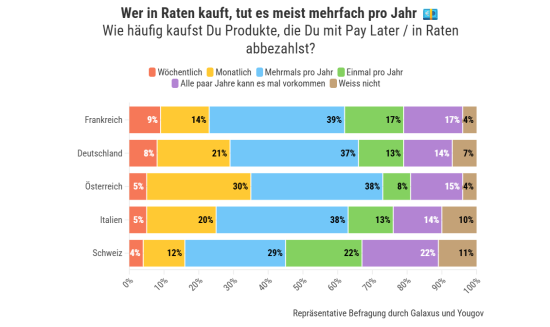 In Deutschland und Frankreich geben vier von zehn und in der Schweiz drei von zehn Pay-Later-Nutzern an, mehrmals pro Jahr auf Rechnung oder in Raten zu kaufen. Einige schließen sogar monatlich und wöchentlich neue Käufe ab, die sie in Raten ausgleichen. In Deutschland kauft jeder fünfte Pay-Later-Nutzer monatlich Produkte, die er oder sie später bezahlt, jede zehnte Person sogar wöchentlich. In Österreich kauft jeder dritte Pay-Later-User monatlich entsprechende Produkte. Die Schweiz zahlt am seltensten auf Rate. Vier von zehn Personen nutzen BNPL-Lösungen nur einmal im Jahr oder noch seltener.