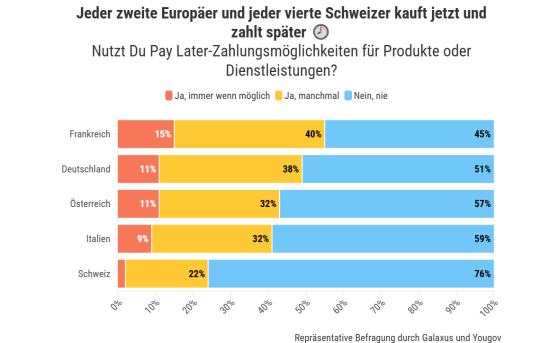 Die Hälfte der Europäerinnen und Europäer nutzt Ratenzahlungen oder Dienste wie „Buy Now, Pay Later“ (BNPL). Das hat eine Befragung des Marktforschers Yougov im Auftrag des Onlinehändlers Galaxus ergeben. Rund die Hälfte der 2.663 Befragten zwischen 15 und 79 Jahren in Deutschland, Österreich, Frankreich und Italien nutzt Ratenzahlungen und Pay-Later-Möglichkeiten. In der Schweiz hingegen setzt nur ein Viertel der Befragten auf die Möglichkeit, bereits erstandene Produkte und Dienstleistungen später zu bezahlen.